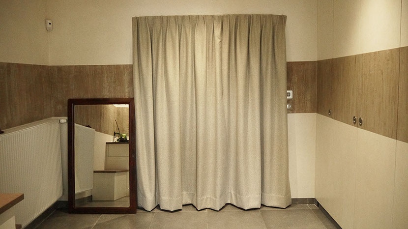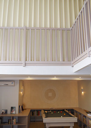 Salle de billard espace amis, cloison rideau vague pour cacher l'espace amis