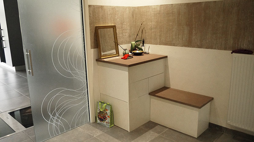 Entrée meuble sur-mesure avec banquette coffre, porte double à galandage vitrage dépolie et sérigraphié