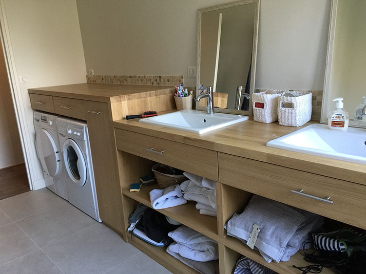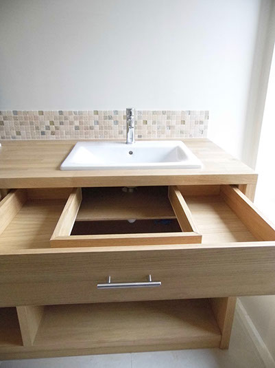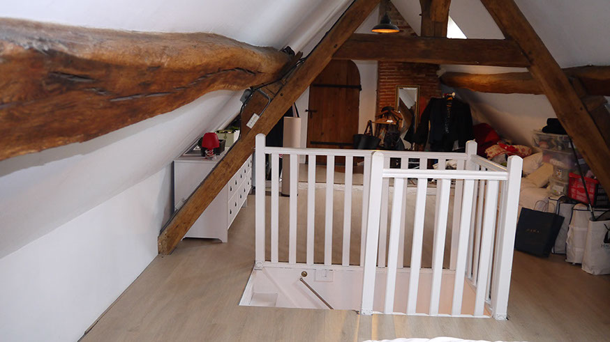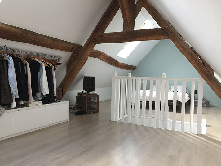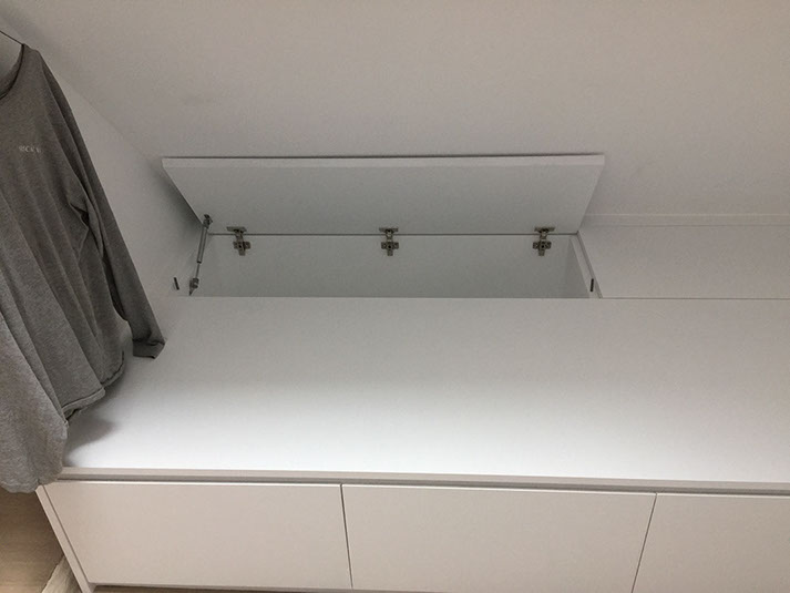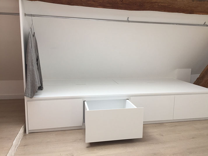 Détail dressing ouvert avec tiroirs et coffres chambre parents