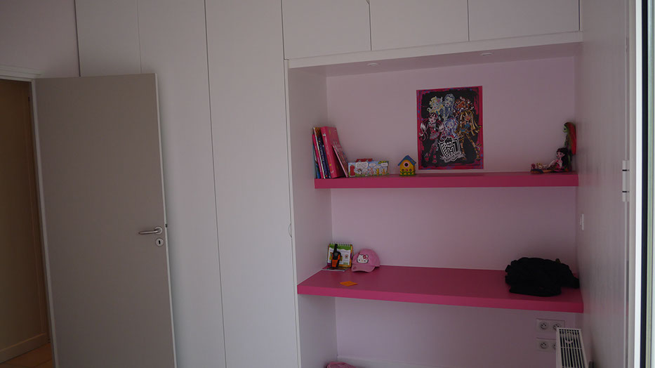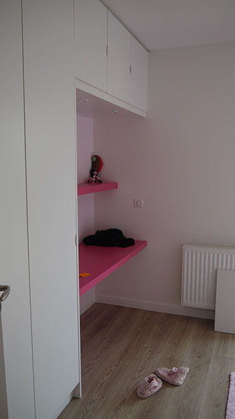 Troisième phase: aménagement intérieur chambres des filles et suite parentale avec création de rangements sur-mesure chambres et escalier